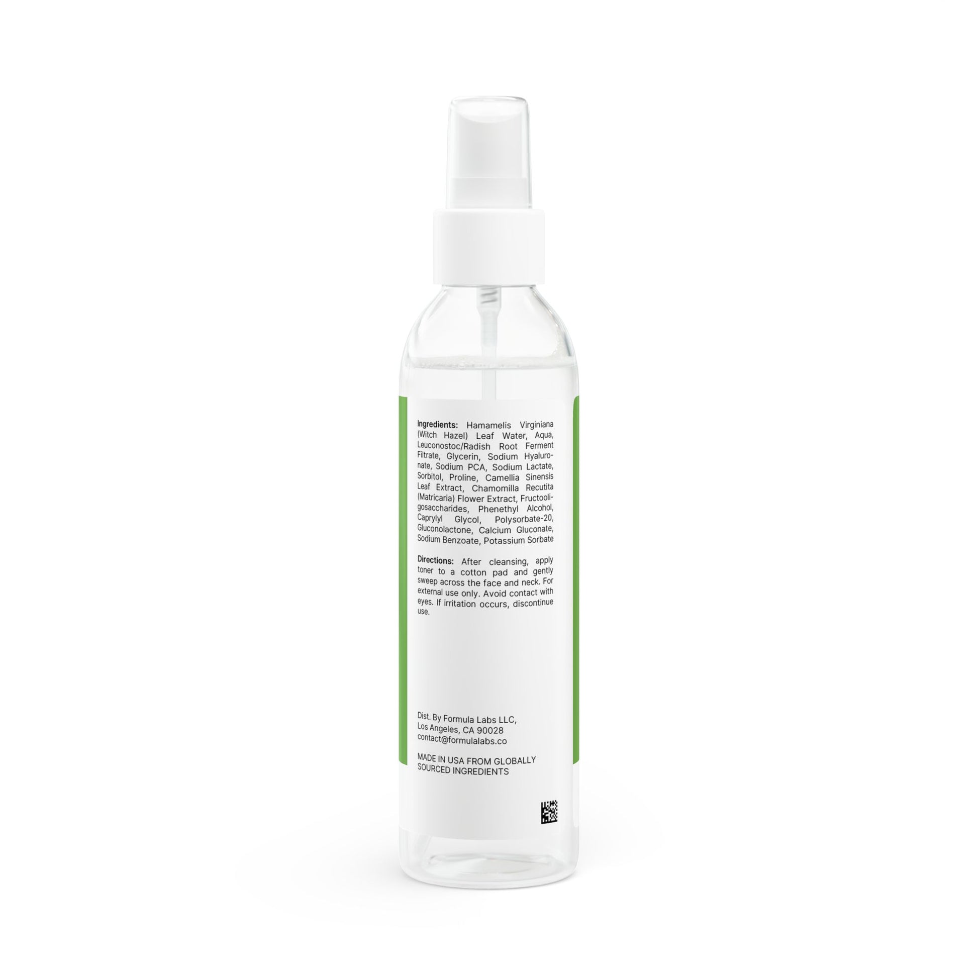 Ingredients: Hamamelis Virginiana (Witch Hazel) Leaf Water, Aqua, Leuconostoc/Radish Root Ferment Filtrate, Glycerin, Sodium Hyaluronate, Sodium PCA, Sodium Lactate, Sorbitol, Proline, Camellia Sinensis Leaf Extract, Chamomilla Recutita (Matricaria) Flower Extract, Fructooligosaccharides, Phenethyl Alcohol, Caprylyl Glycol, Polysorbate-20, Gluconolactone, Calcium Gluconate, Sodium Benzoate, Potassium Sorbate.