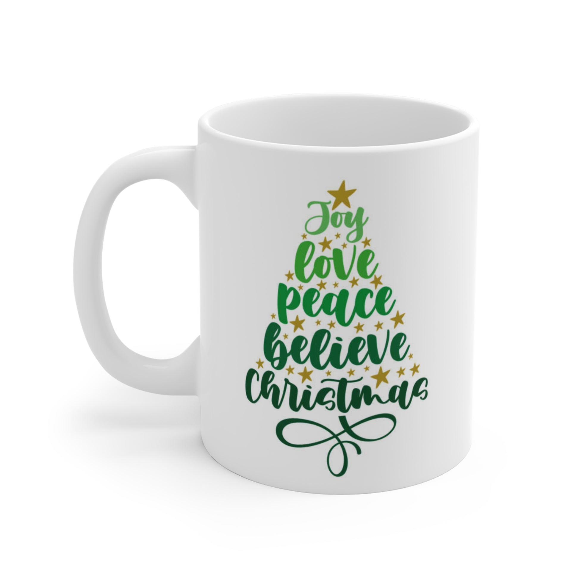 Experience the warmth and joy of the season with this charming mug, perfect for savoring your favorite hot beverages. The delightful design features a festive Christmas tree surrounded by uplifting words like 'Joy,' 'Love,' and 'Peace,' creating a cozy atmosphere that embodies holiday spirit. Ideal for anyone looking to add a touch of cheer to their morning routine, this mug makes a thoughtful gift for family, friends, or even yourself. It's perfect for Christmas celebrations, winter gatherings, or simply enjoying a quiet moment during the hectic holiday season.