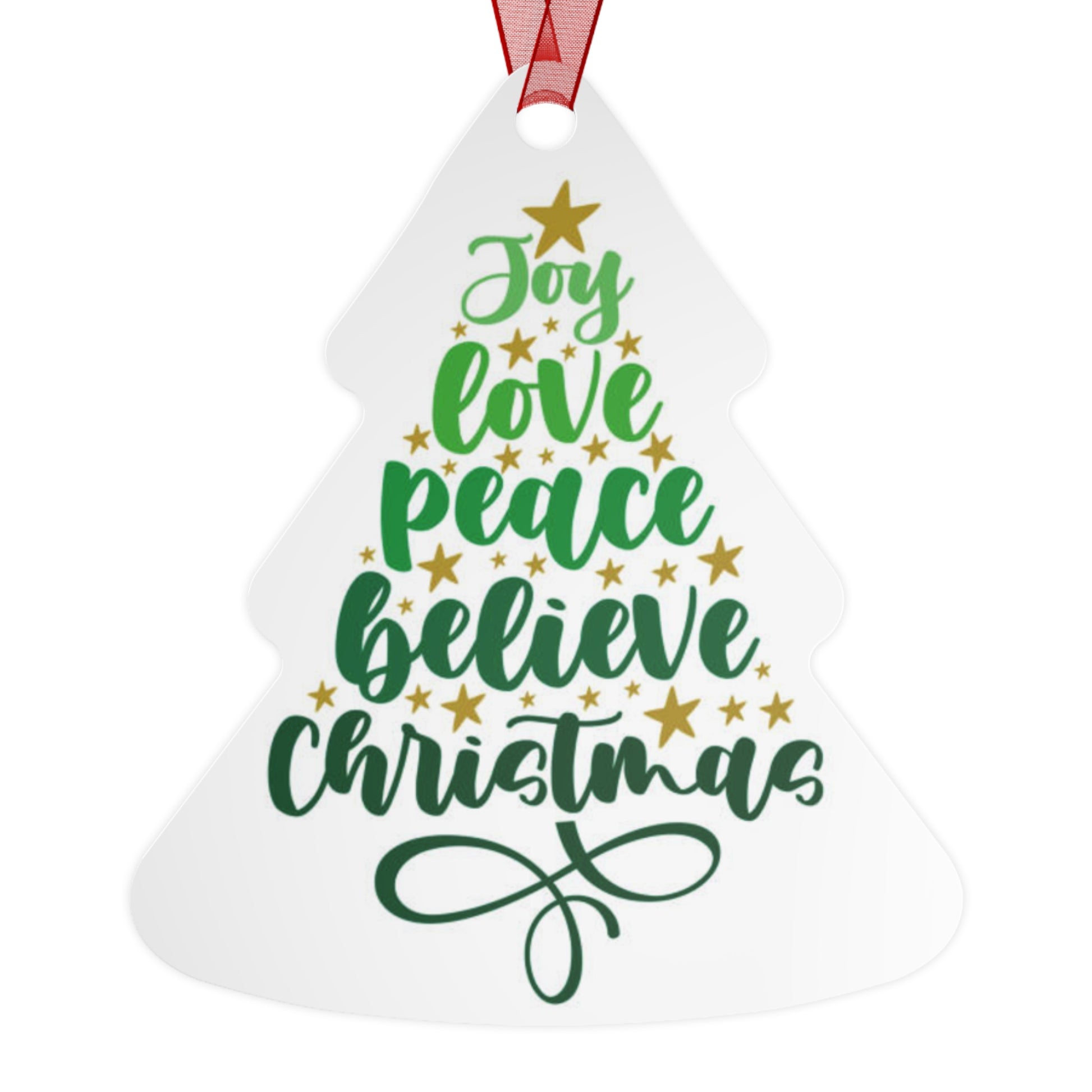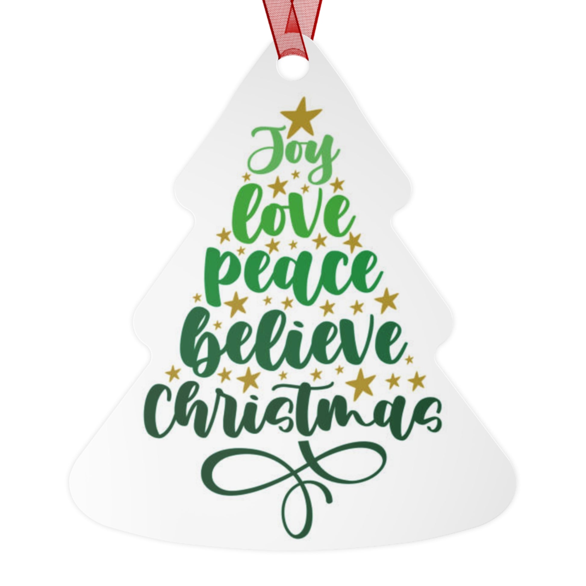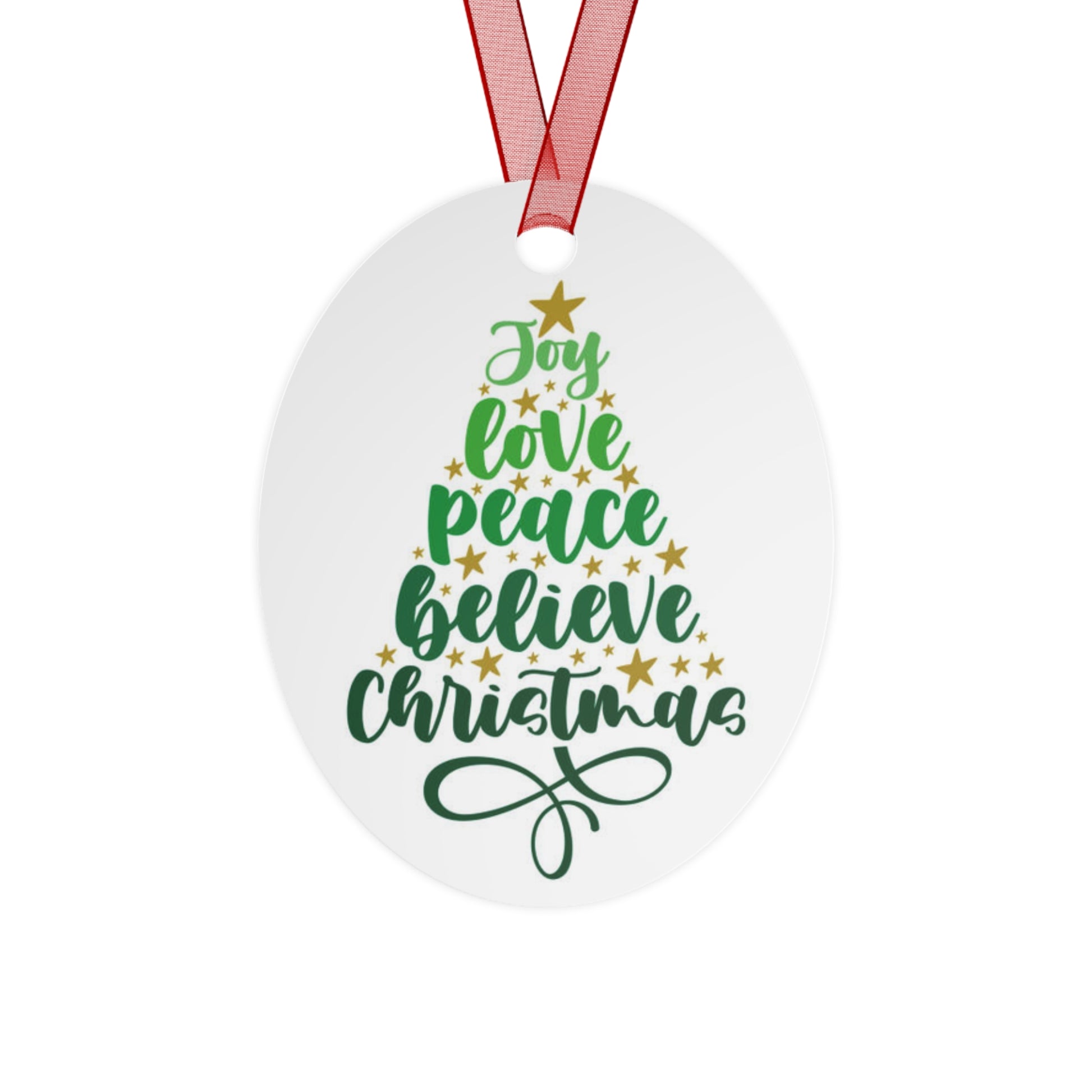 Metal Christmas tree ornaments are durable and will bring holiday cheer for years to come. Print your festive designs on both sides of the white aluminum base, and we'll print them in high resolution with a glossy finish. Their surface is scratch and chip-resistant, so they can be stored together in the famous Christmas decoration box. Choose any or all of these four shapes – bell, tree, round, and oval. Note that there's one ornament per pack, and it already comes with a separate red ribbon for hanging.
