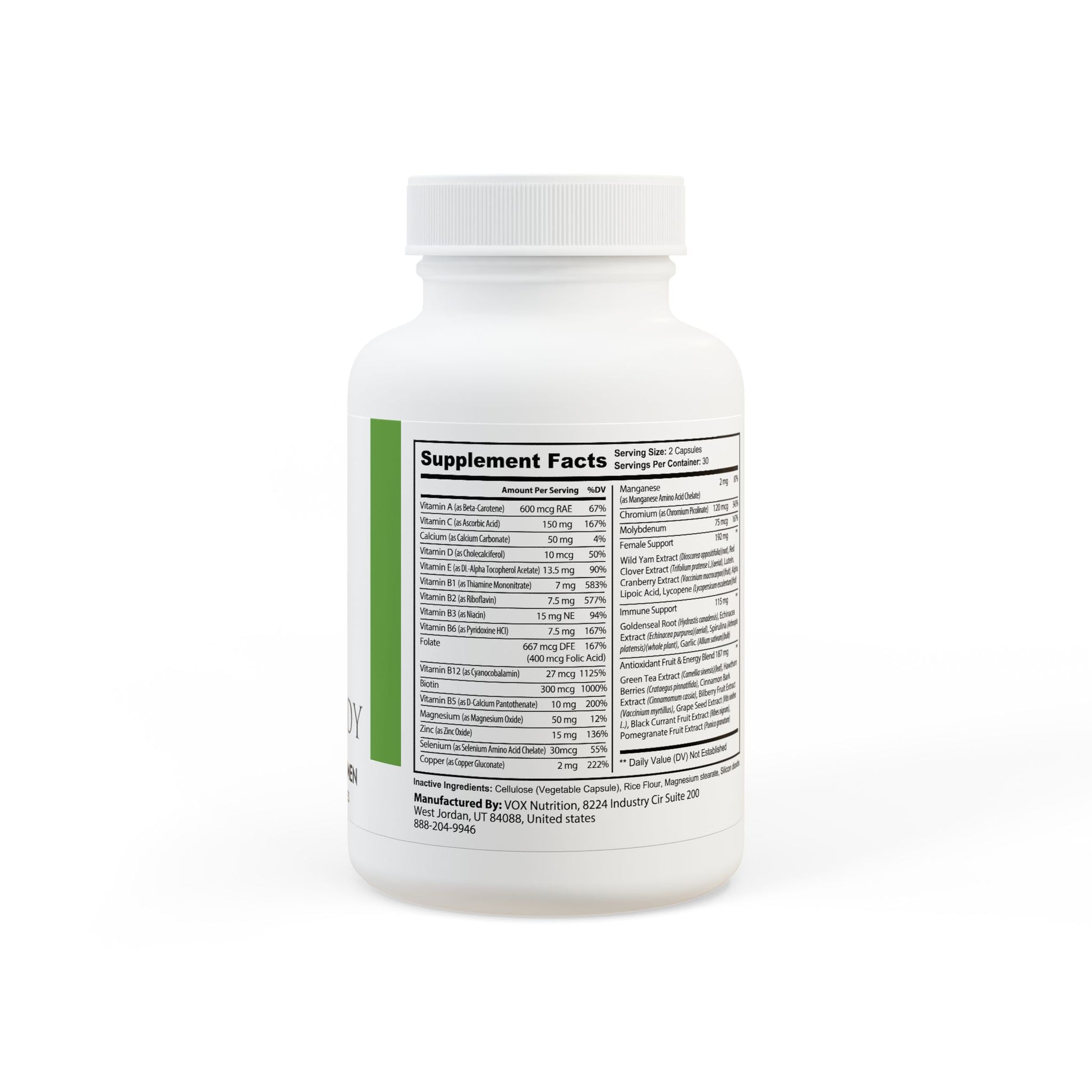 Ingredients: Vitamin A (as Beta-Carotene), Vitamin C (as Ascorbic Acid), Calcium (as Calcium Carbonate), Vitamin D (as Cholecalciferol), Vitamin E (as DL-Alpha Tocopherol Acetate), Vitamin B1 (as Thiamine Mononitrate), Vitamin B2 (as Riboavin), Vitamin B3 (as Niacin), Vitamin B6 (as Pyridoxine HCI), Folate (400 mcg Folic Acid), Vitamin B12 (as Cyanocobalamin), Biotin, Vitamin B5 (as D-Calcium Pantothenate), Magnesium (as Magnesium Oxide), Zinc (as Zinc Oxide), Selenium (as Selenium Amino Acid Chelate), Copper (as Copper Gluconate), Manganese (as Manganese Amino Acid Chelate), Chromium (as Chromium Picolinate), Molybdenum, Wild Yam Extract (Dioscorea oppositifolia)(root), Red Clover Extract (Trifolium pratense L.)(aerial), Lutein, Cranberry Extract (Vaccinium macrocarpon)(fruit), Alpha Lipoic Acid, Lycopene (Lycopersicum esculentum (fruit), Goldenseal Root (Hydrastis canadensis), Echinacea Extract (Echinacea purpurea)(aerial), Spirulina (Arthrospira platensis)(whole plant), Garlic (Allium sativum)(bulb), Green Tea Extract (Camellia sinensis)(leaf), Hawthorn Berries (Crataegus pinnatida), Cinnamon Bark Extract (Cinnamomum cassia), Bilberry Fruit Extract (Vaccinium myrtillus), Grape Seed Extract (Vitis vinifera L.), Black Currant Fruit Extract (Ribes nigrum), Pomegranate Fruit Extract (Punica granatum). Inactive Ingredients: Cellulose (Vegetable Capsule), Rice Flour, Magnesium stearate, Silicon dioxide.