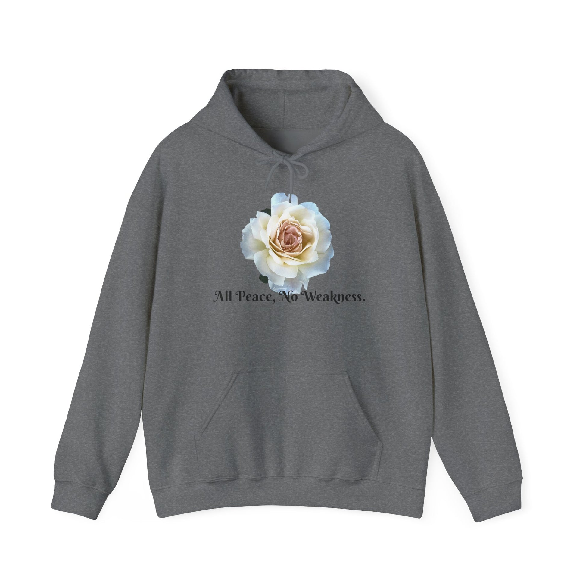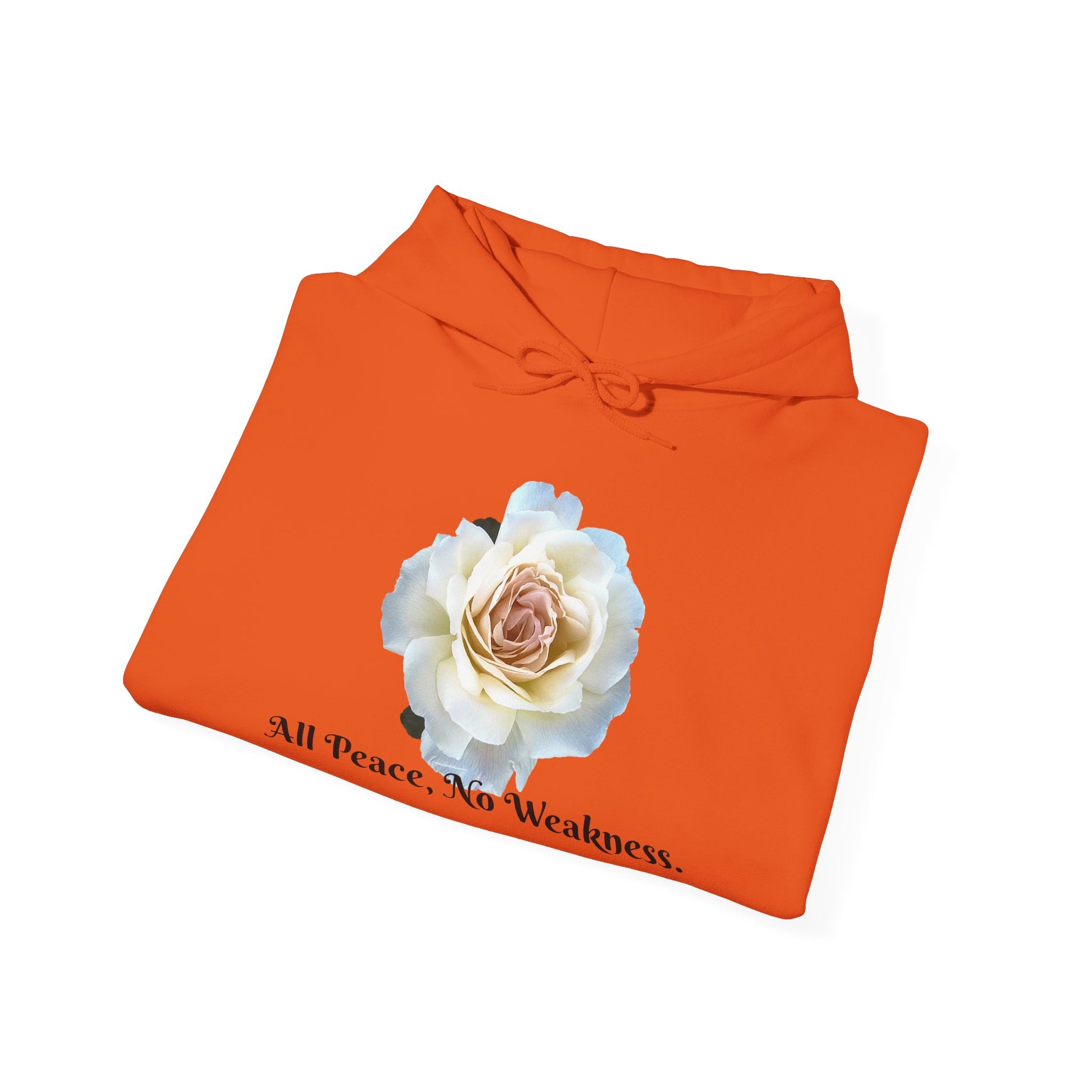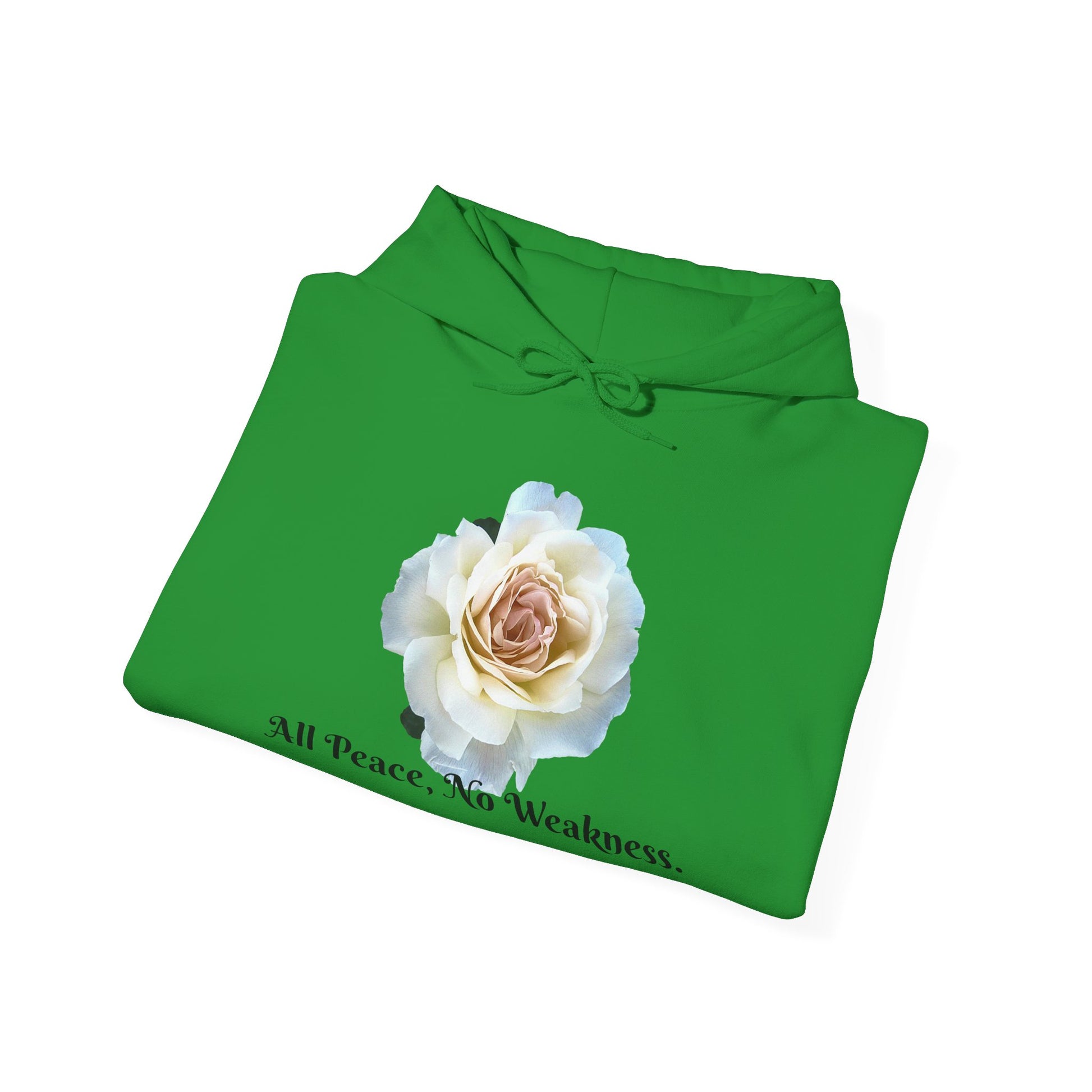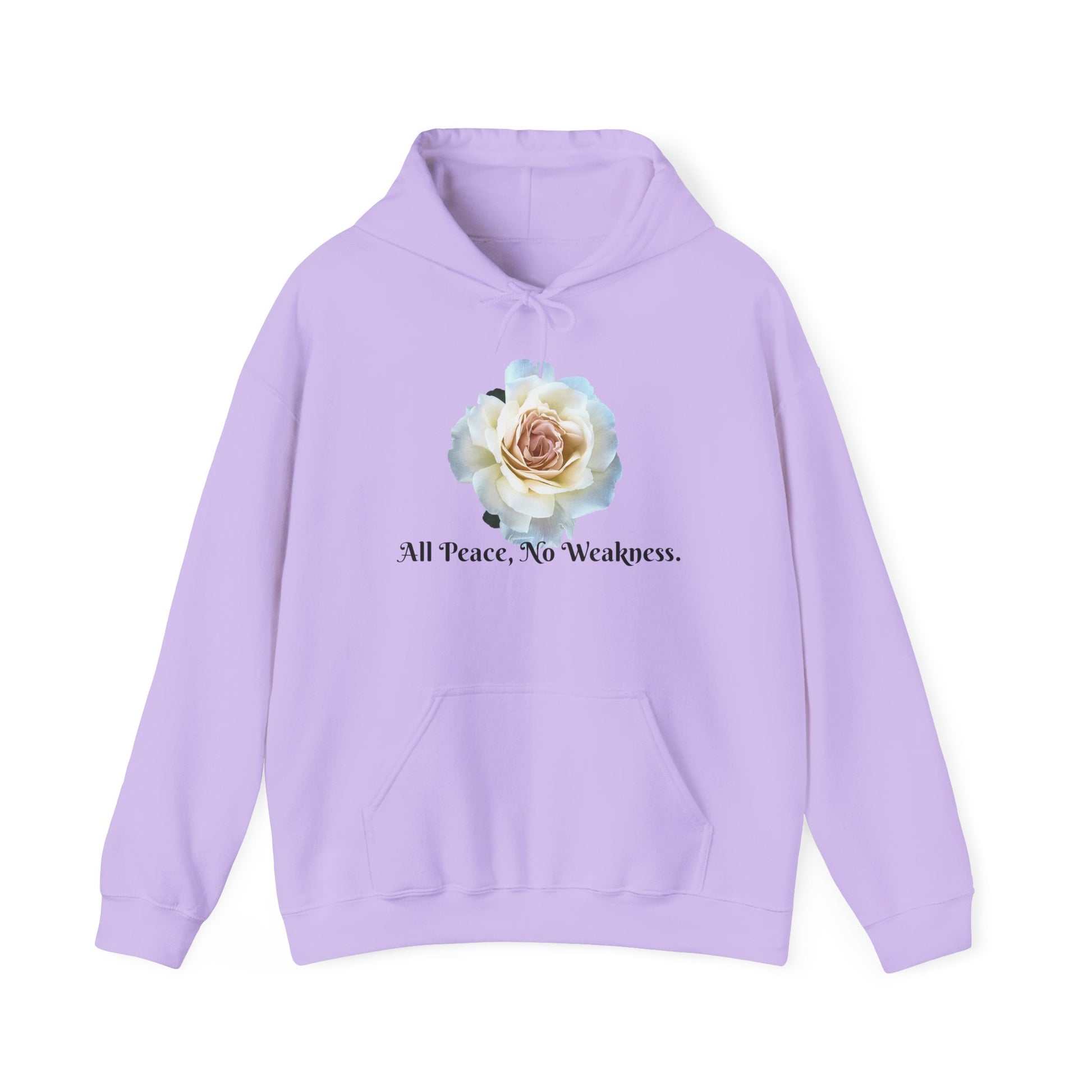 Stay cozy and stylish with this Unisex Heavy Blend™ Hooded Sweatshirt, perfect for any casual occasion. The soft fabric offers a warm embrace, making it an ideal companion for chilly evenings or leisurely weekends. With its spacious kangaroo pocket, you can keep your hands warm while adding a casual flair to your ensemble. Designed for effortless wear, this hoodie suits a range of lifestyles, whether you're out running errands, relaxing at home, or enjoying a bonfire with friends. It makes a thoughtful gift for friends and family during holidays like Christmas, birthdays, or as a comforting gesture any day of the year. Embrace the positivity with the beautiful floral design conveying 'All Peace, No Weakness,' a message perfect for promoting calm and resilience in life.